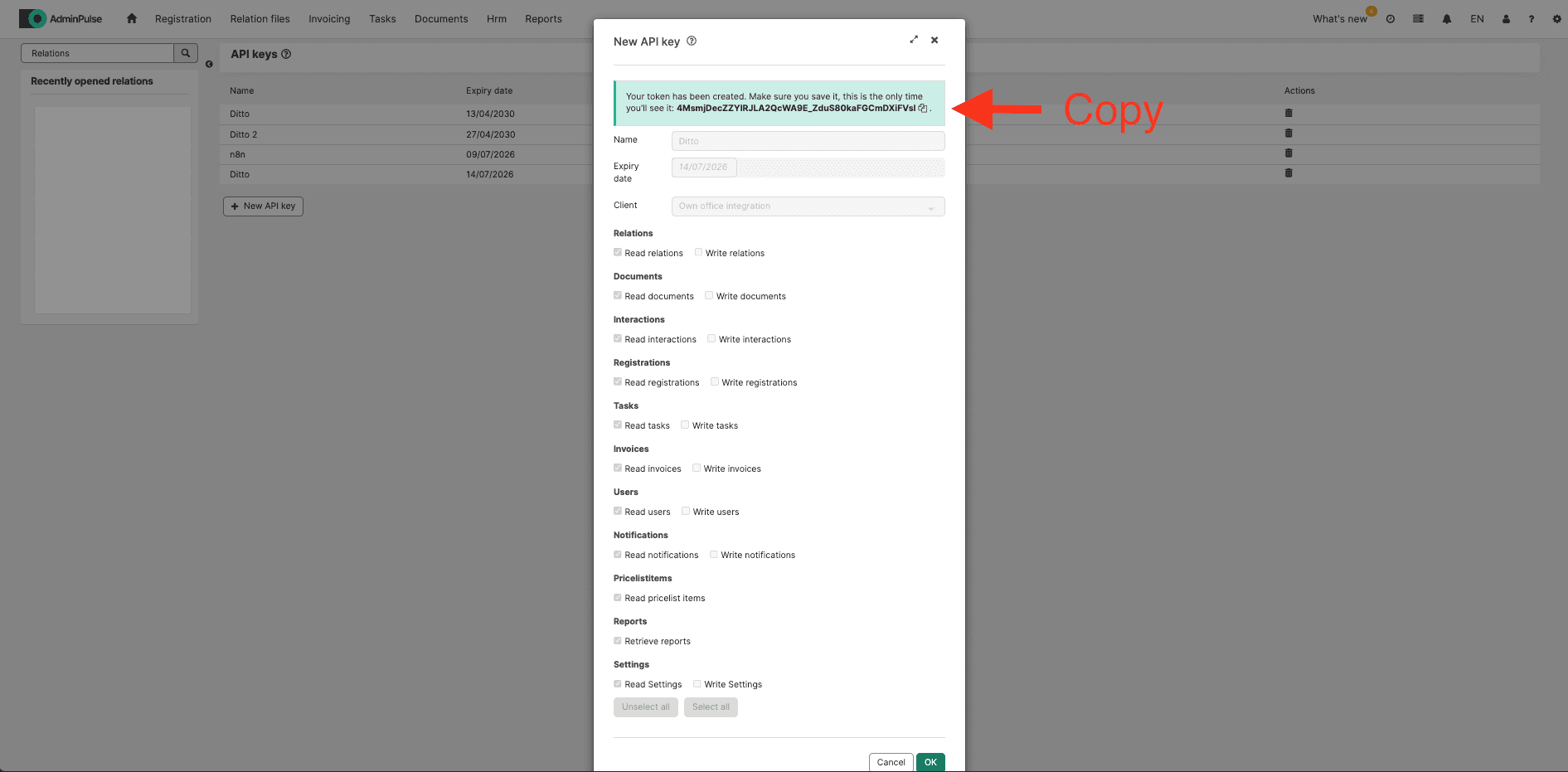3) Enter 'Ditto' as name, select 'Own office integration' as client, select all reading rights and click 'OK':