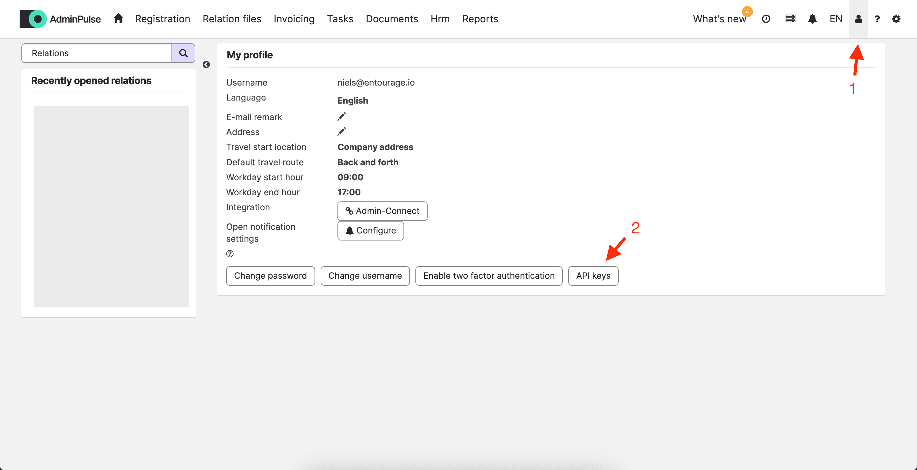 1) Click on 'My profile' and then navigate to 'API keys':